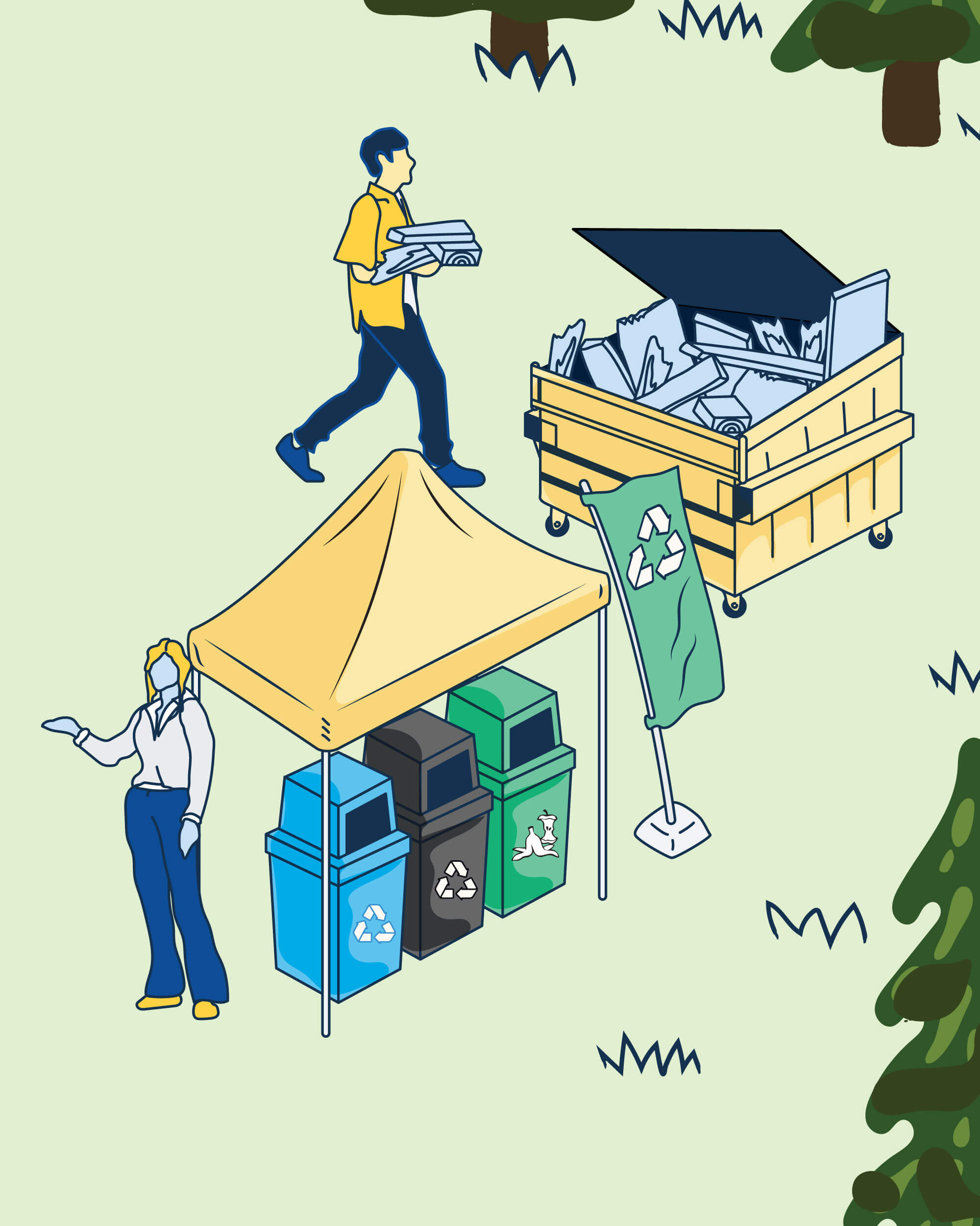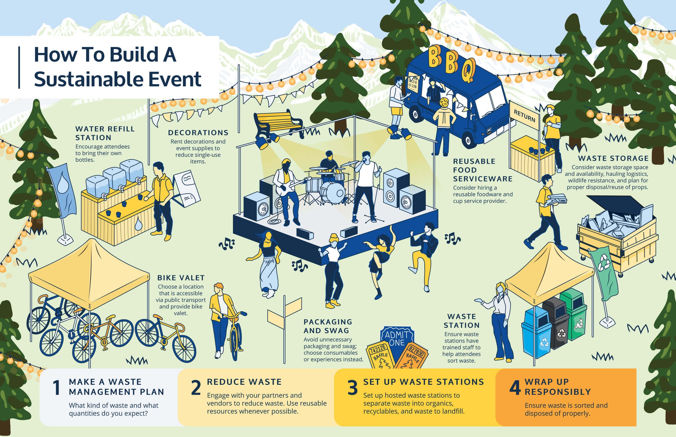 This playful mountain scene highlights the key elements of building a sustainable event.
